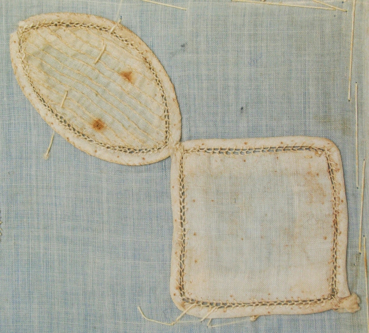 Decorazione per capo d'abbigliamento intimo (?) femminile, con coppia di forme geometriche accostate (quadrato e mandorla): profilatura esterna e specchiature centrali di analogo formato, in mussola di cotone avorio, tra loro collegate ad ago, in filato di cotone avorio (punto incrociato); sulla forma a mandorla, fitta pieghettatura fermata a punto filza