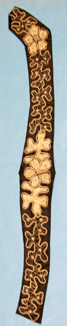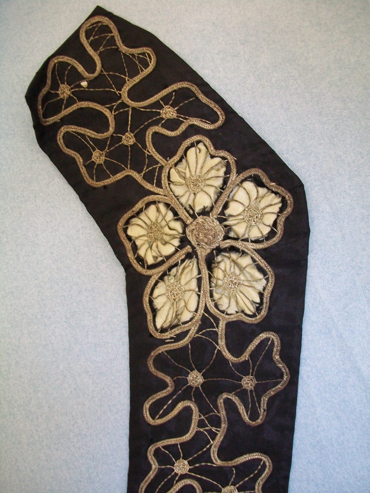 Decorazione a ricamo eseguita su taffetas di seta nero sagomato, mediante applicazione di spighetta in argento filato (punto posato) disposta a formare campiture con decoro "a vermicelles" ed elementi floreali; riempitivi ad ago, in argento filato, con barre di collegamento a punto avvolto ed occhielli su base di fili lanciati. Motivi floreali resi per sagomature traforate, dalle quali emerge uno strato sottostante in raso di seta giallo paglierino, leggermente increspato; pistilli resi mediante applicazione di peduncoli in spighetta d'argento annodata