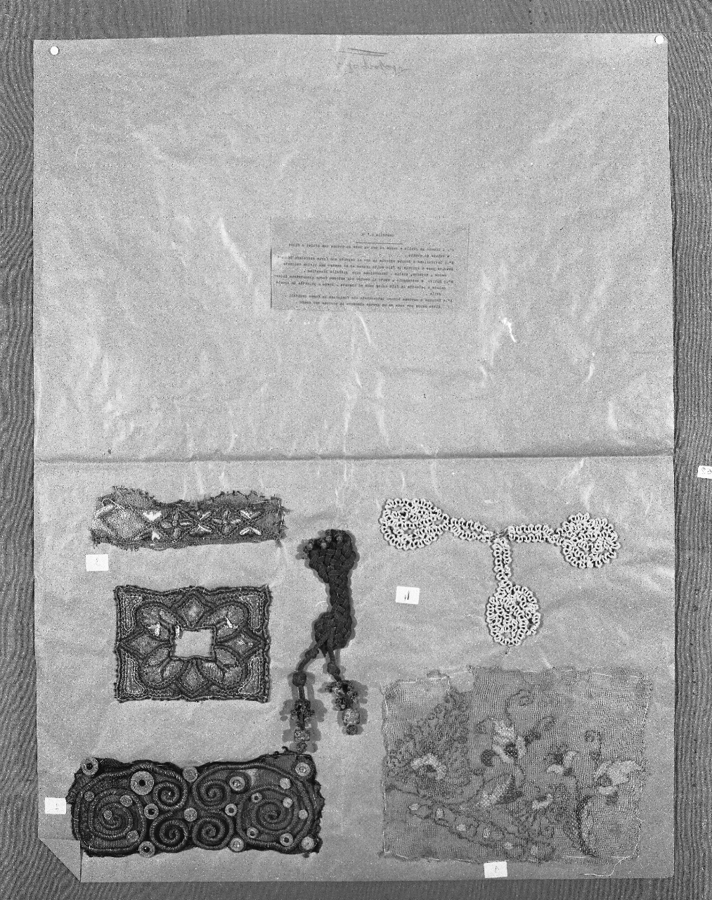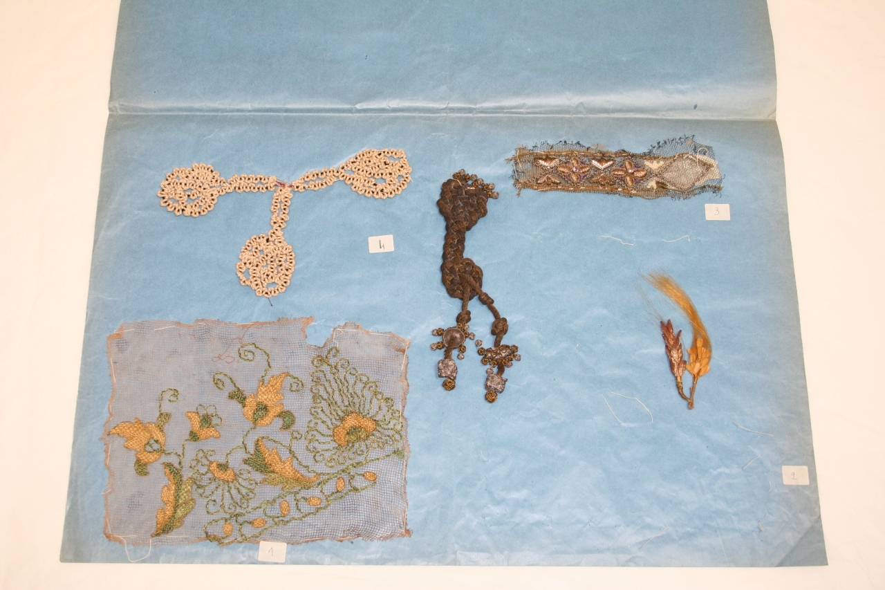 Cartella/campionario di formato rettangolare in cartoncino azzurro. Contiene due frammenti di ricamo e tre guarnizioni per abbigliamento femminile