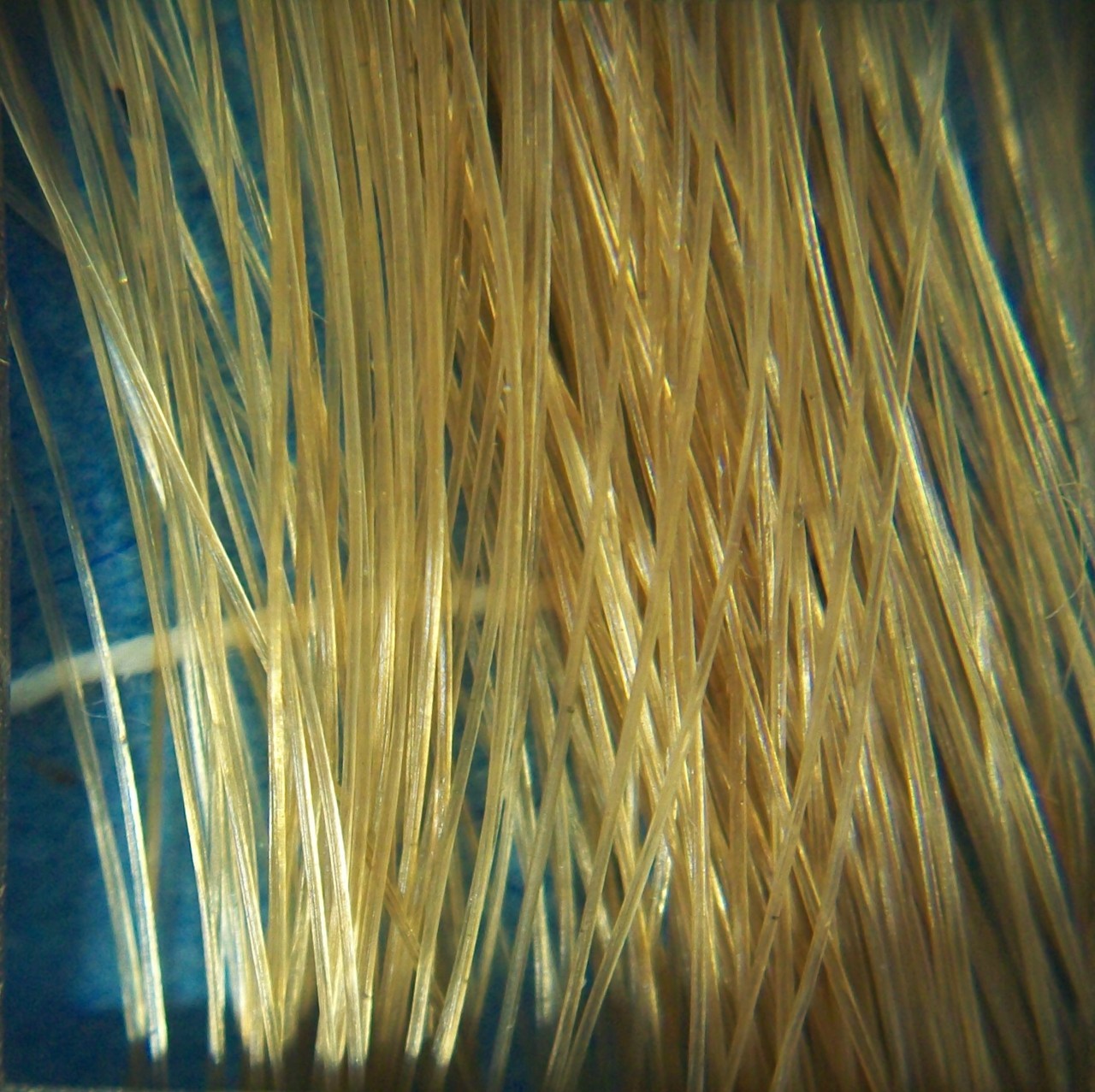 Guarnizione tridimensionale a forma di coppia di spighe: fusti rinforzati, rivestiti in carta color écru e maglia trasversale d'oro lamellare, fittamente increspata; chicchi realizzati in raso di seta e cotone giallo - rinforzato da garza apprettata - e tessuto lamé (orditi in seta avorio e rosa, trama variante in argento filato e oro lamellare). Filamenti in crine artificiale di colore giallo chiaro. Legature in filato di seta giallo