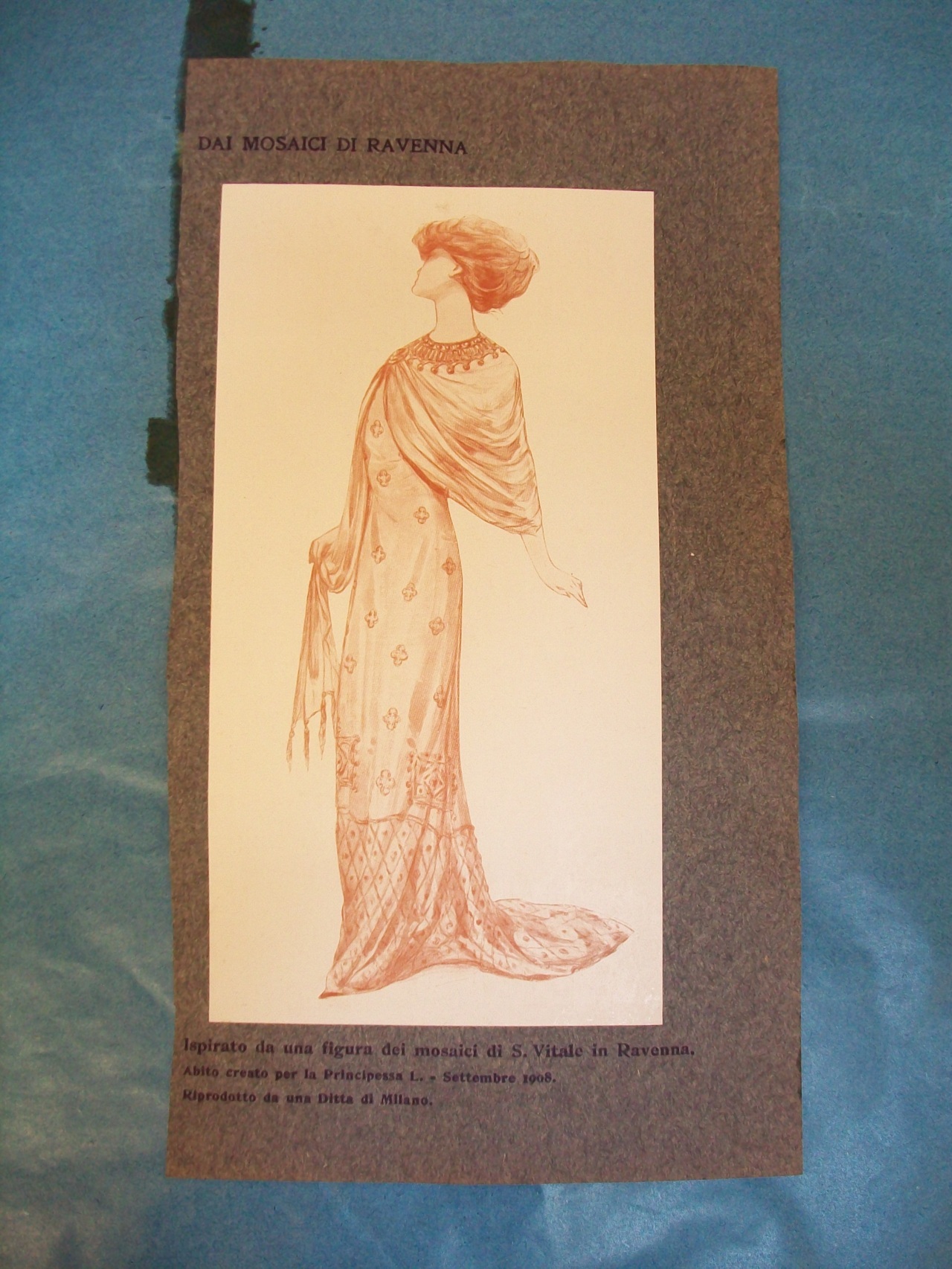 - NOTIZIE STORICO CRITICHE La cartella in oggetto appartiene ad un nucleo di 77 campionari (contenenti tessuti, ricami e merletti) donati alla Galleria del Costume dalla storica del tessile Fanny Podreider nel 1983. Trattasi di materiale appartenuto a Rosa Genoni (madre della donatrice), protagonista del panorama socio-culturale di inizio Novecento nonché promotrice del made in Italy ante litteram: suo infatti il tentativo di lanciare una moda propriamente nazionale (in alternativa ai dettami imperanti di quella francese e d'oltralpe in genere), che traesse ispirazione dal nostro più glorioso passato (in linea con la corrente neo-rinascimentale affermatasi in quegli anni), nonché dalla natura e dal costume popolare regionale, punti di riferimento imprescindibili per le sue creazioni. I campionari contengono un materiale estremamente variegato, proveniente dalla casa di moda milanese Haardt et Fils (che la stessa Genoni diresse a partire dal 1903), e dalla Scuola Professionale Femminile della Società Umanitaria di Milano (presso la quale insegnò, rivestendo anche il ruolo di dirigente della Sezione Sartoria); in altri casi, si tratta invece di materiale (anche storico) che veniva raccolto e impiegato quale fonte di ispirazione, o con finalità didattiche. Per quanto riguarda la cartella in oggetto, essa contiene studi per ricamo in parte riconducibili ad un preciso modello: l'abito ispirato ai mosaici della Basilica di S. Vitale a Ravenna, databile al 1908. La datazione proposta fa riferimento, complessivamente, ai campioni conservati