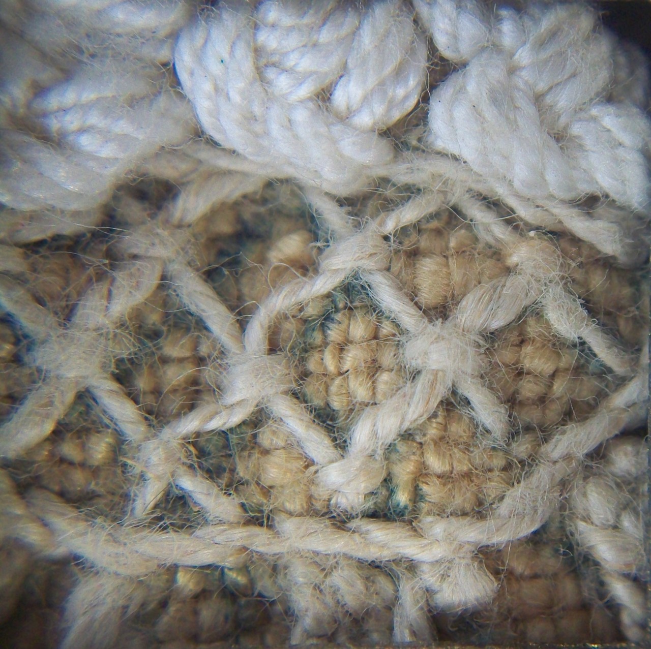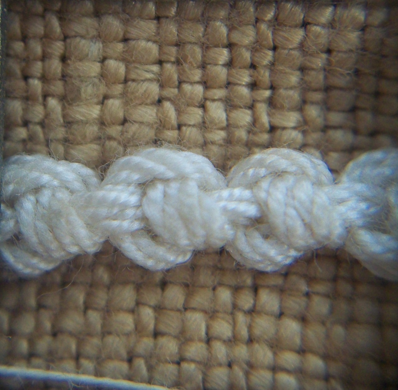 Ricamo realizzato su tela di lino écru (riscontrata cimosa: cm 0.8), in filati di cotone avorio e tinta sabbia, di diverso titolo: infiorescenza stilizzata, con petali aperti a ventaglio, e fusto a volute (punti erba, diritto, palestrina, fili lanciati incrociati e fissati nei punti di tangenza; petali eseguiti ad ago, punto occhiello rinforzato). Presenti tracce del disegno preparatorio ad inchiostro scuro. Reca etichetta in tessuto con numero