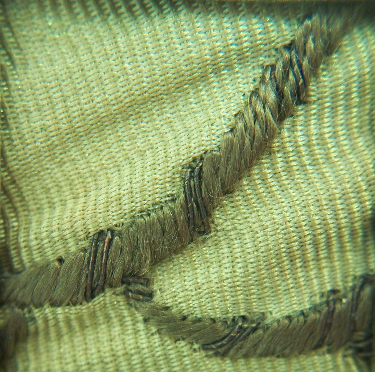 Studio per ricamo realizzato su gros di seta tinta senape (riscontrata cimosa: cm 0.6, armatura gros de Tours). Motivo di medio rapporto a maglie ogivali costituite da tronchi nodosi e tralci con annodature, su fondo rete a maglie romboidali. Lavorazione a ricamo eseguita in filati di seta verde oliva e marrone: profilature a punto sbieco e passato, sormontate da filato metallico color bronzo a punto filza diagonale, e punto cordonetto rinforzato in seta verde e filato metallico; fondo rete con maglie lavorate a punto erba o con fili lanciati incrociati, fissati a punto incrociato (seta marrone e filato metallico tinta bronzo) in corrispondenza dei punti di tangenza tra le maglie. Presenti tracce del disegno preparatorio ad inchiostro scuro