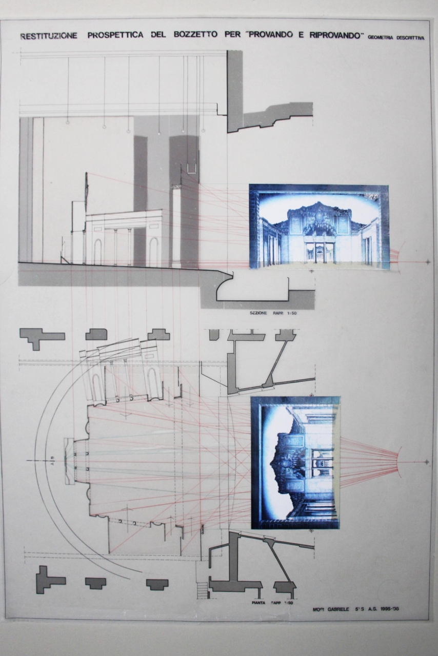 - NOTIZIE STORICO CRITICHE Il disegno rappresenta lo studio scenografico di un atto per la rappresentazione teatrale “Provando e riprovando” di Galileo Galilei. L’opera fa parte del corso sperimentale di “Progettazione scenotecnica” dell’ex Istituto d’Arte di Porta Romana, che insegnava la progettazione della scena teatrale, considerando tutti i fattori legati alla scenografia, alla macchinistica, alla luministica, all’arredamento, alla costumistica e alla logistica del palcoscenico. Nel 1975 fu istituita la sezione di “Moda e Costume” come cattedra annessa alla sezione di “Tessitura” e, dieci anni dopo, nacque, come sezione sperimentale, quella di “Scenotecnica”. Successivamente, nel 1992, venne approvata dal Ministero dell’Istruzione, una sperimentazione nazionale e globale che andava ad affiancarsi ai tradizionali corsi di ordinamento (ovvero la “Sezione Sperimentale di Scenotecnica”). Il corso “Progettazione di scenotecnica” presso l’ex-Istituto, venne condotto, dal 1990 al 1997, dal Professore Giancarlo Mancini, che ne fu da subito il docente promotore