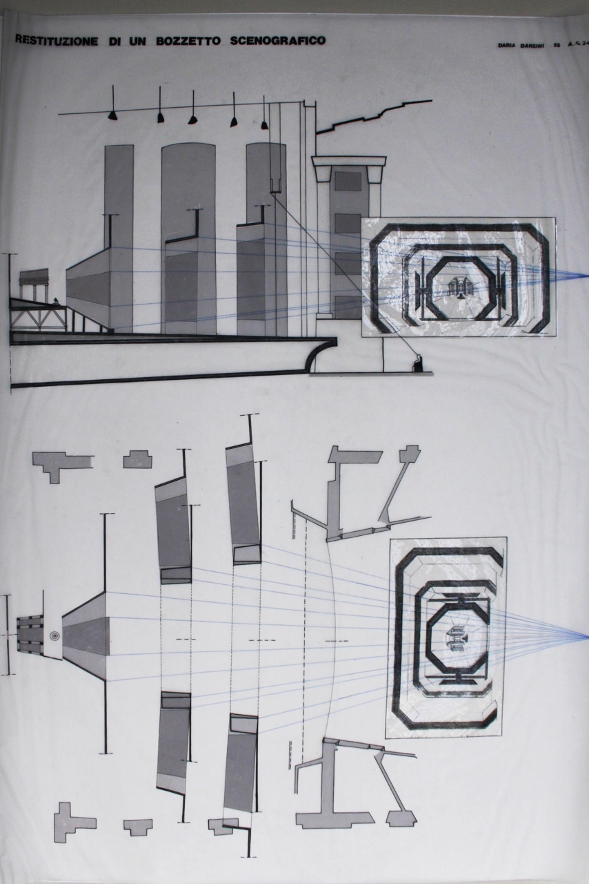 - NOTIZIE STORICO CRITICHE Il disegno rappresenta lo studio scenografico di un atto per la rappresentazione teatrale “La favola di Orfeo” scritta dall'umanista Angelo Poliziano tra il 1478 e il 1483. L’opera fa parte del corso sperimentale di “Progettazione scenotecnica” dell’ex Istituto d’Arte di Porta Romana, che insegnava la progettazione della scena teatrale, considerando tutti i fattori legati alla scenografia, alla macchinistica, alla luministica, all’arredamento, alla costumistica e alla logistica del palcoscenico. Nel 1975 fu istituita la sezione di “Moda e Costume” come cattedra annessa alla sezione di “Tessitura” e, dieci anni dopo, nacque, come sezione sperimentale, quella di “Scenotecnica”. Successivamente, nel 1992, venne approvata dal Ministero dell’Istruzione, una sperimentazione nazionale e globale che andava ad affiancarsi ai tradizionali corsi di ordinamento (ovvero la “Sezione Sperimentale di Scenotecnica”). Il corso “Progettazione di scenotecnica” presso l’ex-Istituto, venne condotto, dal 1990 al 1997, dal Professore Giancarlo Mancini, che ne fu da subito il docente promotore