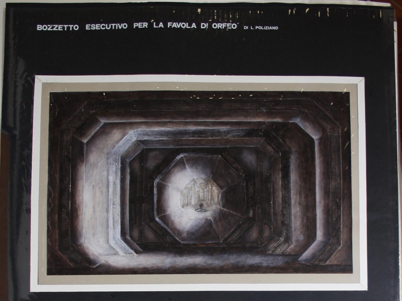 - NOTIZIE STORICO CRITICHE Il bozzetto rappresenta lo studio scenografico di un atto per la rappresentazione teatrale “La favola di Orfeo” scritta dall'umanista Angelo Poliziano tra il 1478 e il 1483. L’opera fa parte del corso sperimentale di “Progettazione scenotecnica” dell’ex Istituto d’Arte di Porta Romana, che insegnava la progettazione della scena teatrale, considerando tutti i fattori legati alla scenografia, alla macchinistica, alla luministica, all’arredamento, alla costumistica e alla logistica del palcoscenico. Nel 1975 fu istituita la sezione di “Moda e Costume” come cattedra annessa alla sezione di “Tessitura” e, dieci anni dopo, nacque, come sezione sperimentale, quella di “Scenotecnica”. Successivamente, nel 1992, venne approvata dal Ministero dell’Istruzione, una sperimentazione nazionale e globale che andava ad affiancarsi ai tradizionali corsi di ordinamento (ovvero la “Sezione Sperimentale di Scenotecnica”). Il corso “Progettazione di scenotecnica” presso l’ex-Istituto, venne condotto, dal 1990 al 1997, dal Professore Giancarlo Mancini, che ne fu da subito il docente promotore