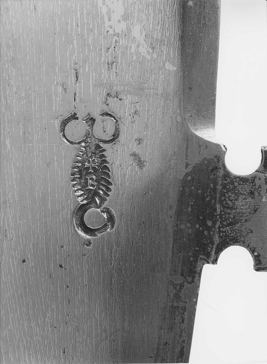 Tipologia ibrida fra un'alabarda e un falcione. Pochi intagli intorno al cuscino; dente dorsale scavato da quattro concavità circolari. Cuspide a sezione di esagono schiacciato. Dorature parziali presenti originariamente su bandelle, gorbia, tallone, prima parte del dorso e dente dorsale