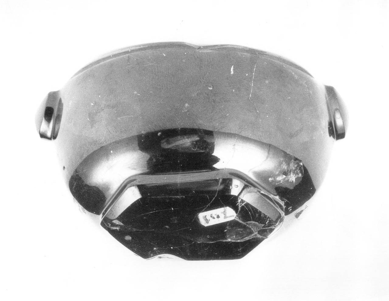 Coppa ricavata da un unico blocco di granato con base esagonale sfaccettata. Il corpo, a navicella, presenta due prese alle estremità e collo rigato lungo il bordo