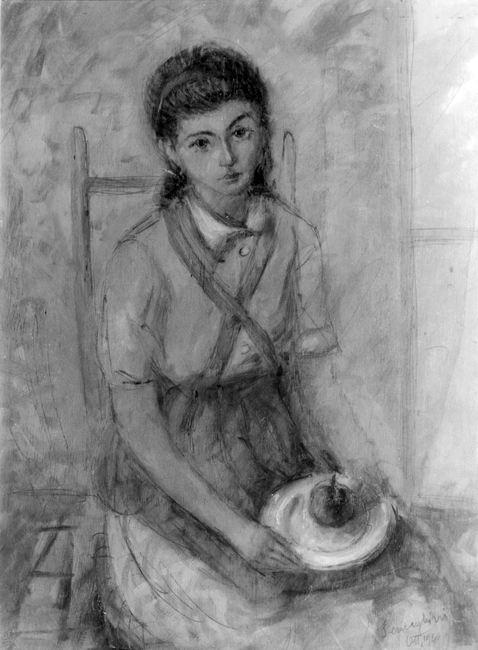 - NOTIZIE STORICO CRITICHE Il dipinto fa parte della numerosa serie di ritratti di fanciulle eseguite da Semeghini durante gli anni trascorsi a Venezia dal 1939 al 1942 (cfr. Pio Semeghini, 1978, fig. 168,170-174, 180). Il dipinto Della Ragione sembra collocarsi all'inizio di questo ciclo, apice del percorso artistico del pittore, in leggera antecedenza rispetto al gruppo dei ritratti delle Ragazze di Burano realizzati tra il 1941 e il 1942. La delicatezza della stesura pittorica ravvivata dalla prevalenza del rosso che ritorna ritmicamente nel colore del grembiule e delle labbra della ragazza oltreché nella mela appoggiata nel piatto, si innesta su un nidito impianto disegnativo che definisce ogni elemento della composizione. Il dipinto trova particolari rispondenze compositive e iconografiche con il disegno della "Bambina con frutta" del 1941 pubblicato dal G. Marchiori nel 1950