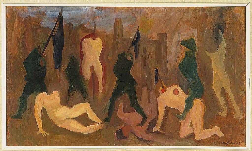 - NOTIZIE STORICO CRITICHE Mafai cominciò a dipingere le "Fantasie" nel 1939 e svolse il tema in 38 scene di torture, massacri, interrogatori, violenze, marce, dove figure spesso sommariamente definite, opulente, indifese, vengono oltraggiate. Le gamme cromatiche sono scure o stridenti: in questo caso prevalgono i marroni e i neri su i rosa salmone degli offesi. Queste scene sono concomitanti alle drammatiche vicende personali e collettive che coinvolgono Mafai e l'Italia; la separazione dalla famiglia, rifugiata a Quarto (Genova) presso Alberto Della Ragione per sfuggire alle leggi razziali e alla guerra. Come spiega l'autore, il quale rifiuta che le sue "Fantasie" vengano pubblicate in accompagnamento alle "Lettere della Resistenza" di Sartre (Pirelli era disposto a portare le sue 24 fantasie a Einaudi per il volume), non si tratta di opere con un valore di denuncia sociale o politica, bensì sono espressione di un suo stato d'animo, del suo bisogno esistenziale: "...Quello che faccio non è per compiacere qualcuno ma soltanto necessità e soddisfazione di me stesso" (citato da G. Appella, Mario Mafai : le "Fantasie", 1989, p. 12 e p. 89). Sui rapporti tra Mafai e Alberto della Ragione si veda la scheda di "Autoritratto"