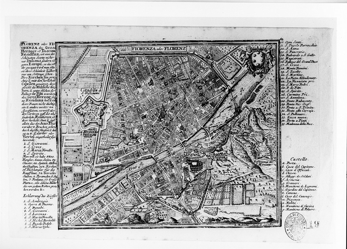 - NOTIZIE STORICO CRITICHE Ai lati, nei margini, è presente una legenda esplicativa scritta in lingua tedesca che recita Florenz oder Fiorenza (...); 35 richiami riguardanti gli edifici più notevoli e 15 riferibili alla Fortezza S. Giovanni di Battista. La pianta risulta inserita all'interno dell'Atlante militare tedesco Force d'Europe ..., tav. 62. L'esemplare in questione risulta essere staccato dal testo e in tutto simile alla pianta dello Stridtbeck (1700), ma non si sa con precisione quale delle due sia stata riprodotta per prima