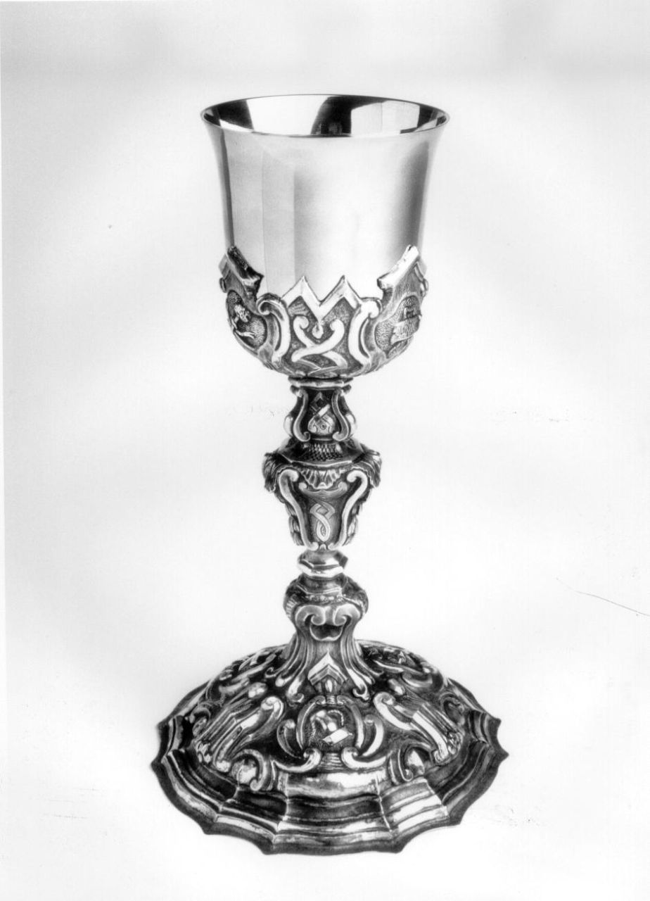 Calice lavorato. piede centinato profilato da gradino modanato con orlo piatto granito, chiuso inferiormente da lamina liscia con stemma pontificio. Corpo leggermente bombato e ornato da volute e motivi angolari realizzati a cesello, uniti a formare cartigli. Nei campi interni sono sbalzati in leggero rilievo i Simboli della Passione. Fusto partito in nodi di cui il principale a pera, decorato, come il piede, da volute e motivi a intreccio stilizzati ricordanti vagamente le moresche. Brevi foglie d'acanto preludono ad un piccolo nodo piriforme, decorato in modo analogo al principale. Sottocoppa a margine libero, ornato da tre cartelle con Simboli della Passione e trattenente una coppa alta, poco svasata e slabbrata