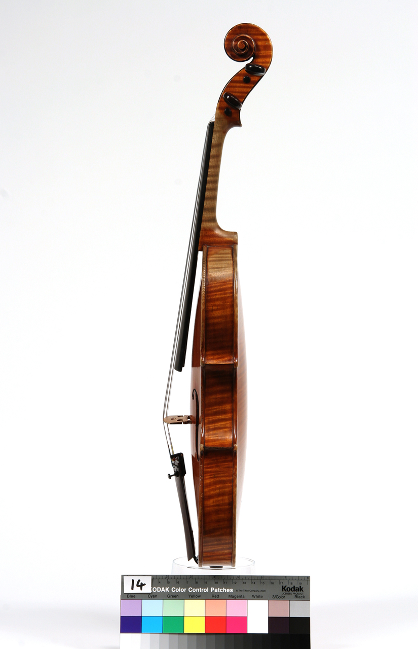 La tavola armonica è in due pezzi simmetrici di Abete rosso a taglio radiale, privo di indentature e con venatura parallela alla commettitura, stretta al centro e più ampia ai bordi. Nella metà destra è presente una lunga linea per lo più parallela all'andamento delle fibre, probabilmente dovuta a un attacco micotico nel corso della vita dell'albero. Non sono presenti perni di posizionamento. Le "effe" sono molto lunghe e oblique, con palette a lati divergenti, lunghe, le inferiori più grosse delle superiori. Il fondo è in due pezzi di Acero a taglio sub - radiale, con evidente marezzatura media simmetrica e discendente dal centro verso i bordi. Non sono presenti perni di posizionamento. La nocetta, originale e integra, è complanare al fondo, con profilo ovale allungato nel senso dell'altezza e base chiusa con profonde unghiature. Le sei fasce sono di Acero a taglio radiale, con marezzatura analoga a quella del fondo, lievemente obliqua rispetto a quest'ultimo e orientata omogeneamente in modo discendente dal fondo verso la tavola. Il manico è di Acero con marezzatura analoga a quella del fondo. La testa è solidale con il manico. Il riccio è simmetrico. La vernice è di colore giallo bruno dorato