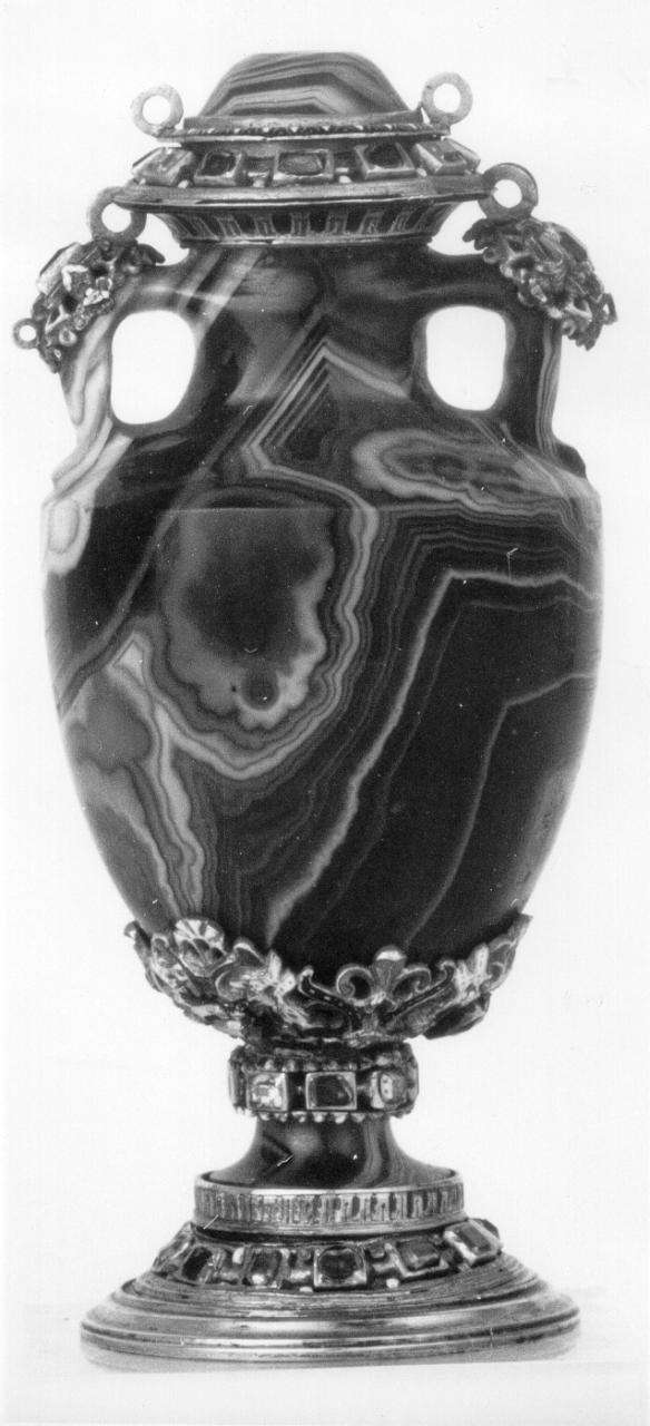 Vaso in agata sardonica realizzato in tre pezzi; piede circolare in oro agradini decorato da sei diamanti alternati a sei rubini; fascetta con pietre preziose decora anche la gola del sostegno; corpo ad anfora con due manici, decorato in basso da motivi floreali a smalto; coperchio orlato da bordo in oro smaltato con al centro un foro per la presa