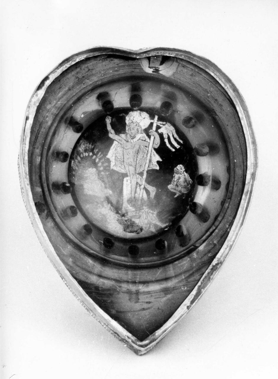 L'incisione è passata in foglia d'oro e racchiusa entro una cornice tonda. Viene presentato il Cristo Trionfatore mantellato, la mano sinistra è alzata in segno di benedizione, mentre la destra regge lo stendardo. Intorno personaggi inginocchiati in atteggiamento di adorazione