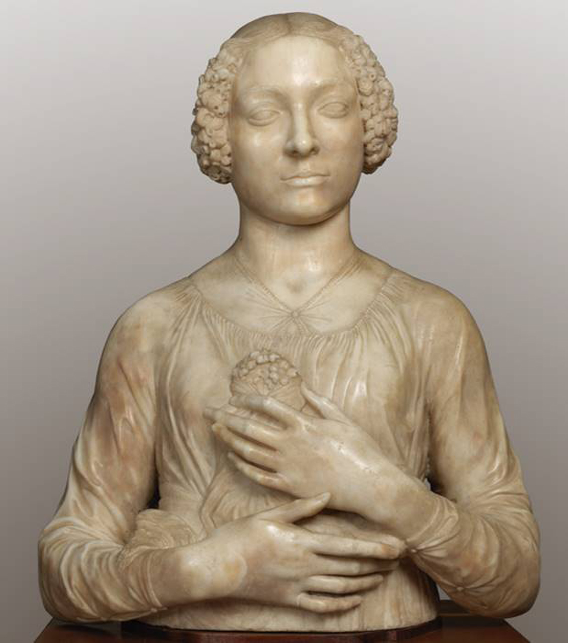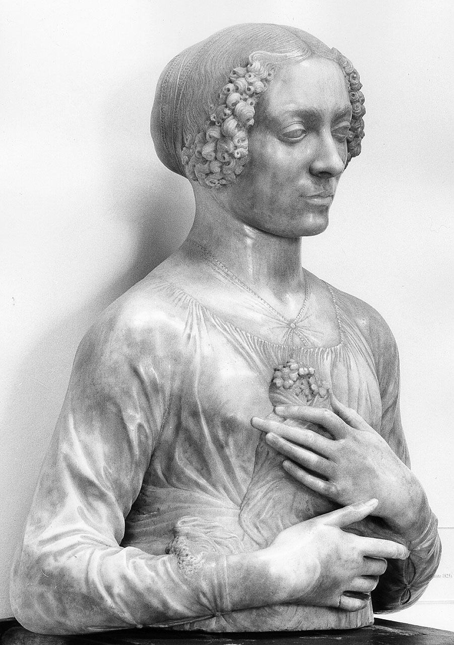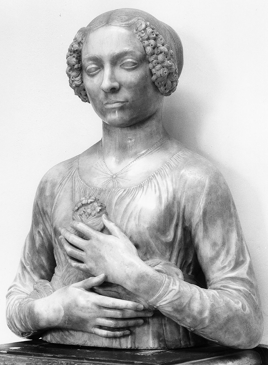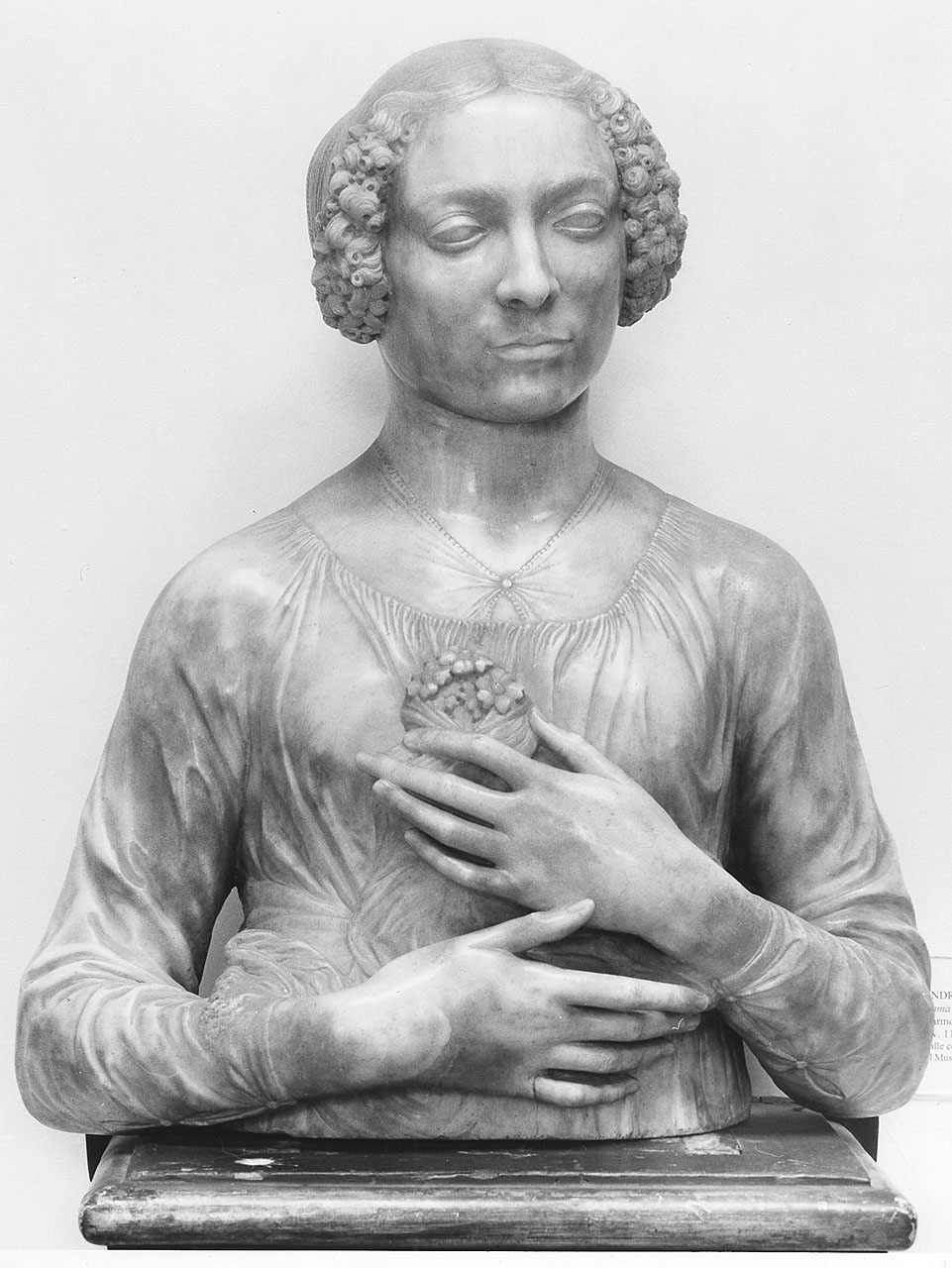 - NOTIZIE STORICO CRITICHE La prima citazione documentaria che possediamo su questa scultura, utile per conoscerne la provenienza risale al 1822, quando viene ricordata nel testamento di Francesco Ceccherini come opera di Donatello. Nel febbraio 1825 gli eredi del Ceccherini nel trattare la vendita del busto con la galleria degli Uffizi segnalano un precedente acquisto da una nobile famiglia fiorentina, peraltro sconosciuta. Il busto fu acquisito per la galleria degli Uffizi dal granduca Leopoldo II in quello stesso anno, e rimase agli Uffizi fino al 1873 quando fu passato al Bargello. La provenienza costituisce un elemento che esclude ulteriormente l'origine medicea del marmo verrocchiesco, che a più riprese è stata sostenuta. L'attribuzione a Donatello rimase in auge fino al 1882 quando il Bode assegnò il busto di gentildonna a Verrocchio, notandovi affinità con le Virtù del Cenotafio Forteguerri a Pistoia. L'attribuzione è ormai universalmente accreditata, anche se non sono mancate nella storia critica del busto delle proposte che vogliono vedervi l'intervento di collaborazione di Leonardo. La collaborazione sembra in realtà da escludere per l'unità che caratterizza l'ideazione e l'esecuzione. La cronologia si colloca nella seconda metà degli anni Settanta. Il busto è stato variamente identificato, soprattutto da chi ha sostenuto una provenienza medicea, come il ritratto di Lucrezia Donati donna amata platonicamente da Lorenzo de Medici, e addirittura lo si è voluto riconoscere in un "ritratto di Lucrezia" citato nell'inventario del palazzo di Via Larga stilato alla morte del Magnifico, in realtà da identificare con il ritratto di Lucrezia Tornabuoni, madre del Medici stesso. I sostenitori della attribuzione a Leonardo vi hanno invece visto un ritratto di Ginevra Benci, in virtù di una presunta somiglianza della donna raffigurata nel marmo con quella del dipinto omonimo conservato a Washington, opera giovanile di Leonardo (databile tra 1478 e 1480) che si ricollega per più versi alla dama del Bargello. La Dama col mazzolino è un'opera innovativa nel panorama della scultura italiana innanzi tutto per il taglio della figura fino ai fianchi e per la rappresentazione delle mani: elementi che trovano confronti con la pittura nordica che a Firenze nella seconda metà del Quattrocento ebbe una larga diffusione. A questa cultura si richiama anche il naturalismo della figurazione, con l'attenta e minuziosa descrizione dell'abito e dell'acconciatura, lavorata con la stessa cura su tutti i lati tanto da far immaginare che essa sia stata realizzata per una esposizione a tutto tondo. Una particolare attenzione viene riservata alla gestualità delle mani alla quale è riservata una valenza comunicativa. Butterfield (in Verrocchio Sculptor and Painter... 2019) sulla base dei confronti stilistici proposti già da Bode assegna l'esecuzione della scultura tra il 1475 e il 1480