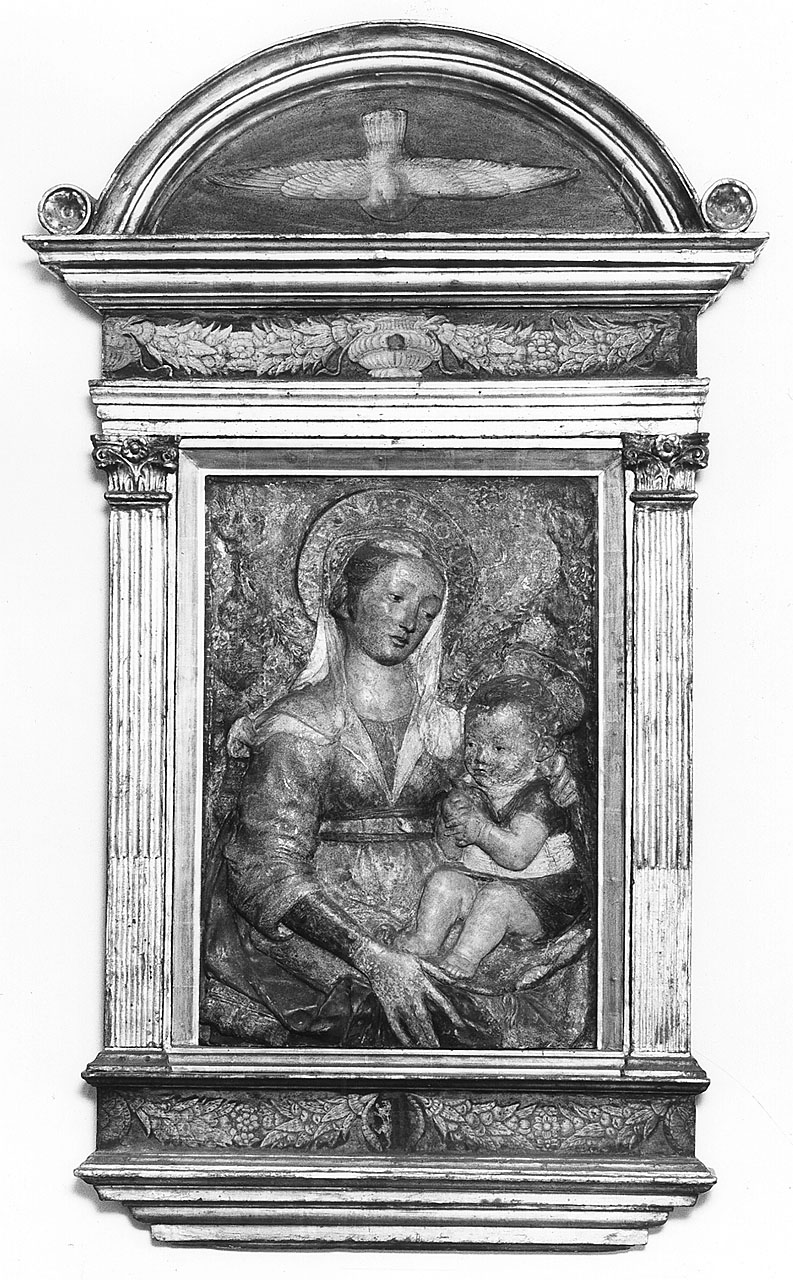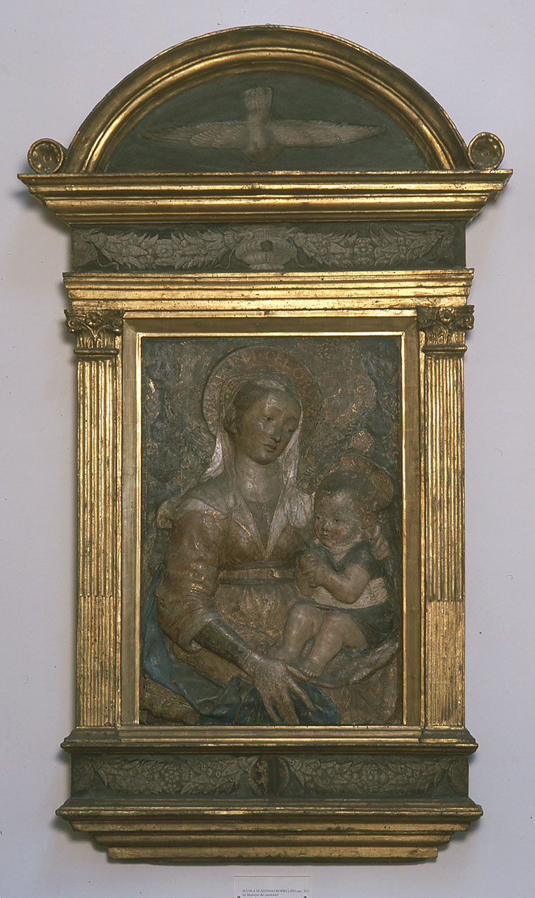 - NOTIZIE STORICO CRITICHE Il rilievo raffigura la Madonna con il Bambino che gioca con un cardellino. Alle spalle della Vergine, sullo sfondo, a bassissimo rilievo due candelabri e un festone che sovente hanno dato il nome a questa tipologia, conosciuta in un grande numero di esemplari e repliche. Questo dimostra la grande fortuna iconografica di questo soggetto la cui ideazione si suole far risalire ad un prototipo, presumibilmente in marmo o forse anch'esso in terracotta, variamente attribuito dagli studiosi. Da una attribuzione a Desiderio da Settignano (Robinson) e al Maestro delle Madonne di Marmo la critica sembra ora orientarsi concordemente ad un riferimento ad Antonio Rossellino. Esemplari di questa tipologia si conservano in molti musei tra i quali ricordiamo il Museo Bardini e il Victoria and Albert di Londra. Il rilievo del Bargello è stato acquastato dallo Stato nel 1902 dalla pieve di San Giusto nel Mugello. E' conservato all'interno di una cornice a tabernacolo di pregevole fattura presumibilmente originale. In basso vi è raffigurato uno stemma partito di famiglia non identificata