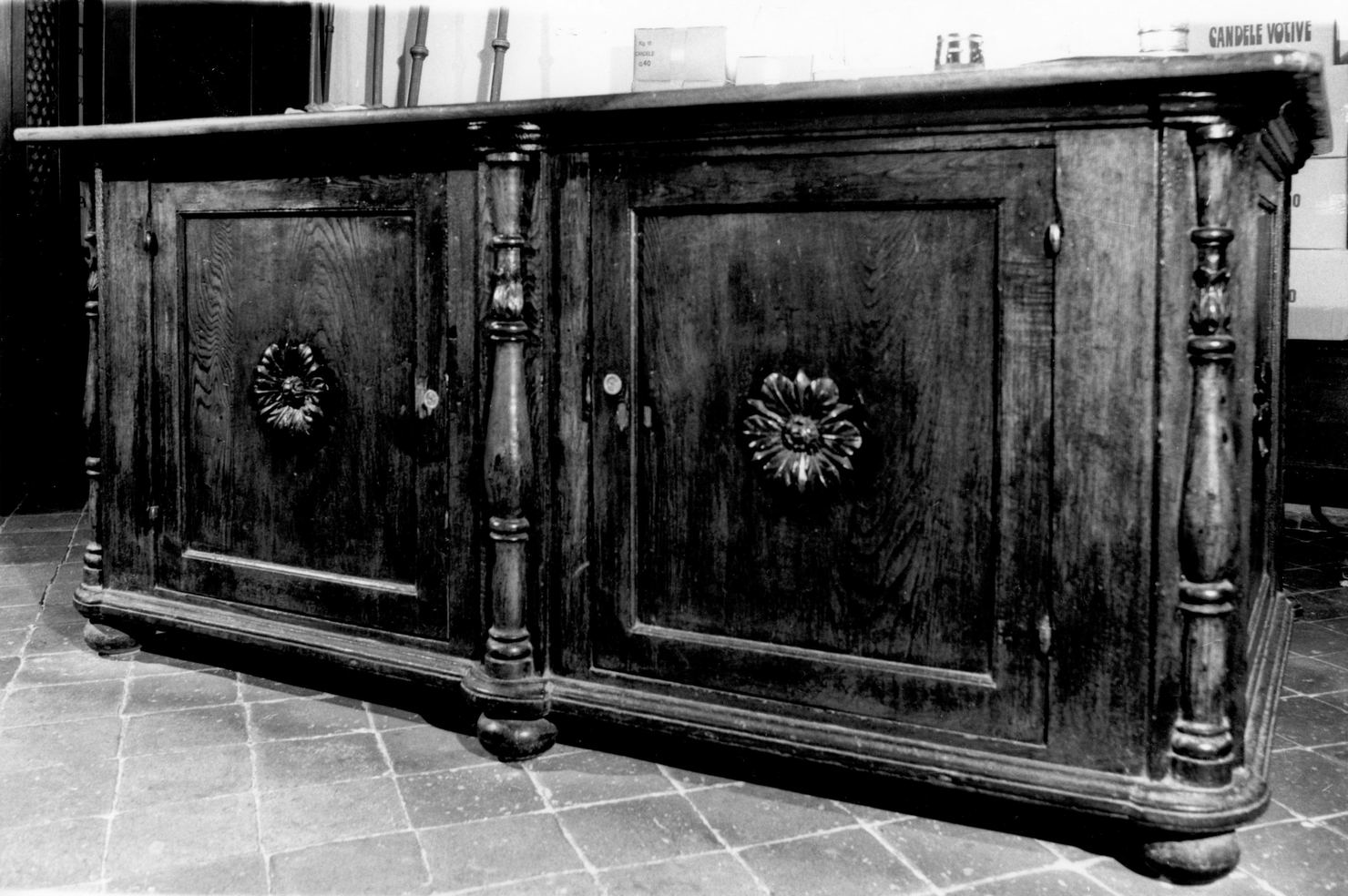 piedini: a cipolla; basamento: rettangolare sagomato e modanato; fronte: decorato da due colonnine laterali e una centrale a balaustro decorate a fogliette; le due ante hanno sportelli quadrati con specchiature geometriche intagliate e rosetta centrale; piano superiore aggettante