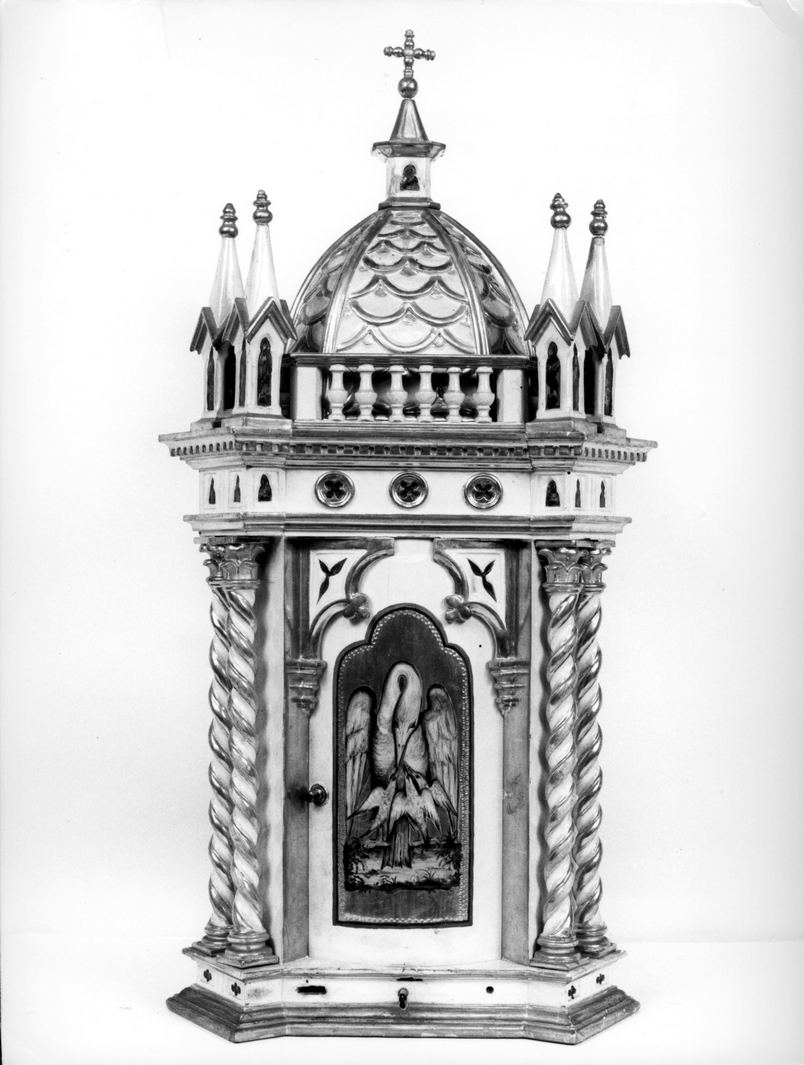 tabernacolo a tempietto gotico con basamento modanato, prospetto caratterizzato da colonne tortili, e al centro sportello trilobato con dipinto un pellicano nella sua pietà. Parte superiore composta da cupola con copertura a pelte, balaustra e guglie gotiche, terminante con crocetta apicale