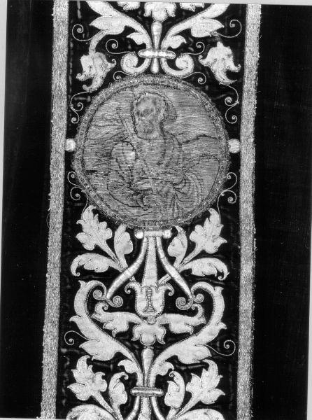 Casula in velluto tagliato unito, rosso (recente) con stolone anteriore e posteriore ricamato a tessuti riportati ripreso da altra veste. Disegno a volute di foglie d'acanto affrontate a formare piccole maglie ovaliformi in successione verticale. Al centro dello stolone posteriore è un tondo a ricamo in 'opus florentinum' raffigurante san Paolo.Frangia di profilatura in seta rossa e oro. La casula è priva di fodera