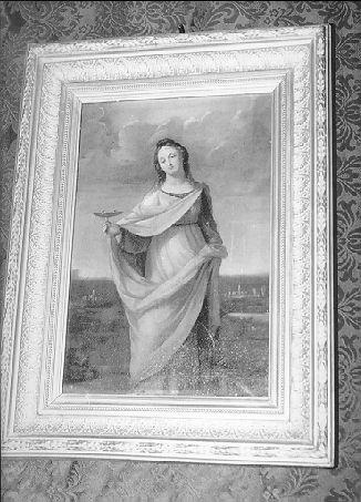 La Santa, in primo piano su un arioso sfondo paesaggistico, tiene nella mano destra un piatto con due occhi