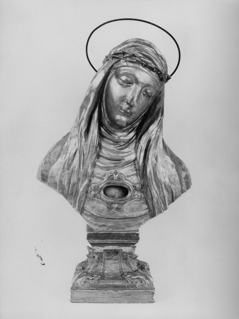 busto sostenuto da piedistallo quadrangolare ornato da racemi vegetali, raffigurante la santa Caterina coronata di spine, con teca ovale in basso