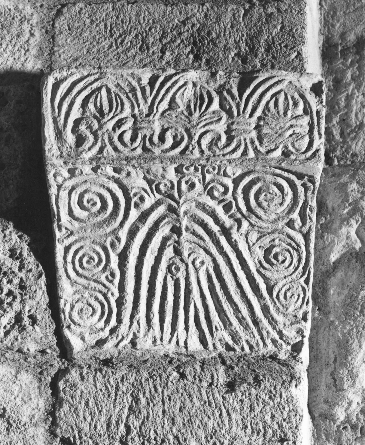 forma: quadrangolare; motivo: a palmetta stilizzata circondata da volute sovrastata da un motivo a volute intrecciate inglobanti della palmette