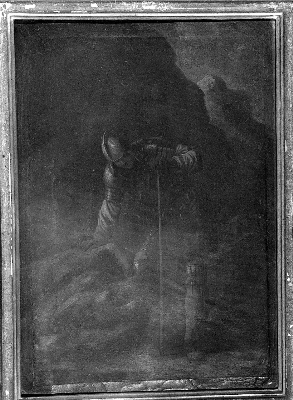 - NOTIZIE STORICO CRITICHE Il quadro, al momento dell'acquisizione da parte della Villa di Poggio a Caiano, è stato collocato, insieme al suo pendent, nella terza stanza terrena della Fabbrica Nuova, costruita nel 1775 a confine con il muro di cintadel giardino della villa, verso la strada maestra. Risulta infatti nominato per la prima volta nell'inventario del 1781 e il suo soggetto descrittocome "un soldato vestito di ferro appoggiato con la destra a un masso e con la sinistra a un bastone". Lo stile della pittura e il soggetto alla 'salvadora' ne suggeriscono un'esecuzione avvenuta nell'ultimo quarto del Settecento, in una bottega fiorentina