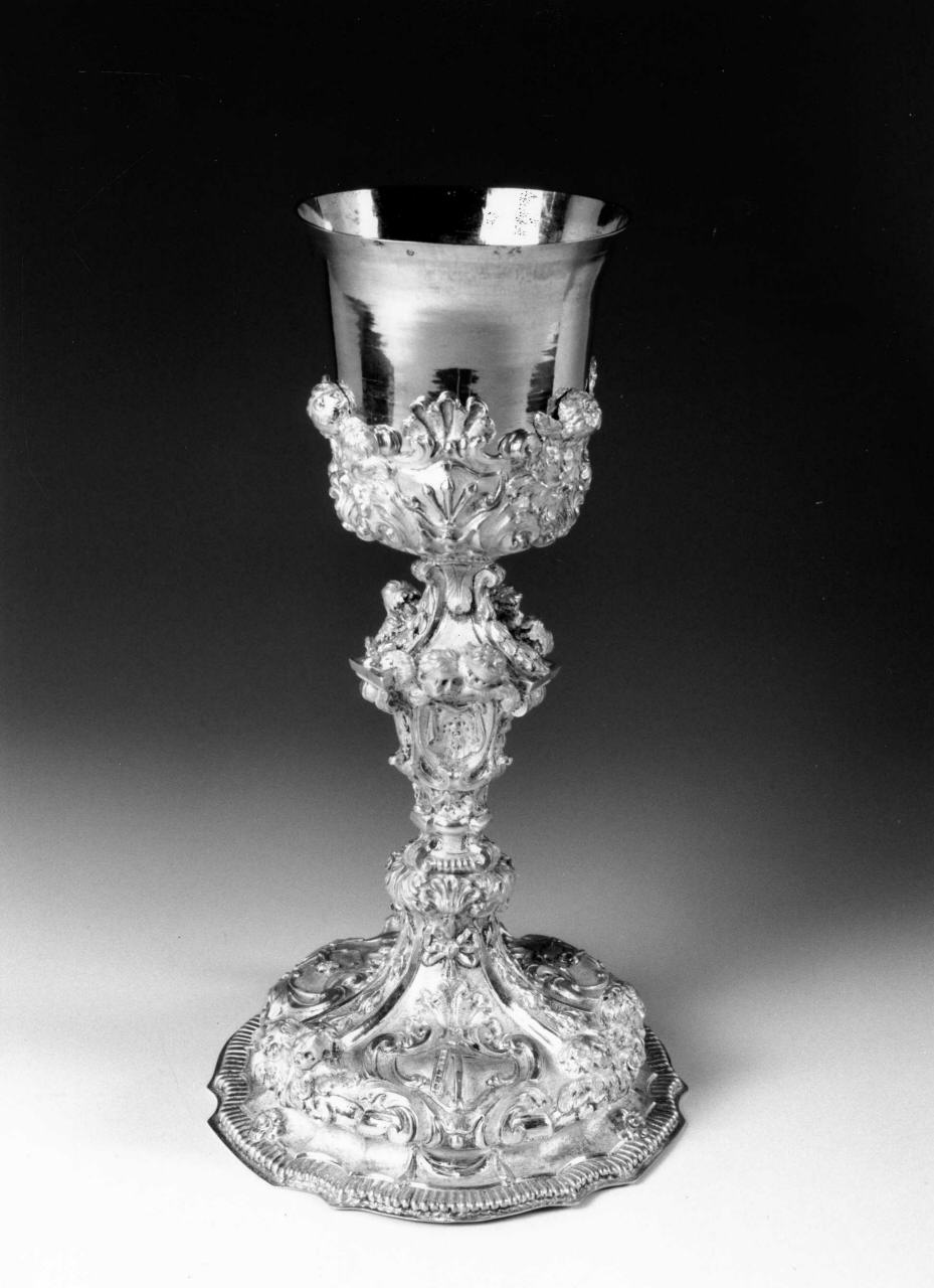Calice centinato, impostato su piede bombato a profilo concavo e convesso; fusto con nodo di raccordo bombato e nodo principale architettonico; coppa alta e slabbrata con sottocoppa a margine libero. La superficie del piede è delimitata da una cornice a fitte baccellature seguita da un'alta fascia liscia - che riprende il profilo sagomato esterno - ornata alternativamente da corolle floreali e drappi a festone, è scandita in tre campi da nervature binate terminanti ciascuna in coppie di testine angeliche. I settori sono decorati da cartelle profilate da volute e foglie di acanto, conchiglie e perle e nastri annodati in forma di fiocco; le cartelle recano i simboli della Passione di Cristo. Palmette e foglie di acanto rivestono il nodo di raccordo. Il nodo principale, tripartito come il piede, è decorato da coppie di testine angeliche alternate a mensole sostenenti serti vegetali e da cartelle con i simboli della Passione di Cristo. Il sottocoppa, il cui margine è sottolineato da testine di cherubini e palmette, è costituito da decorazioni vegetali e cartelle con i simboli della Passione di Cristo