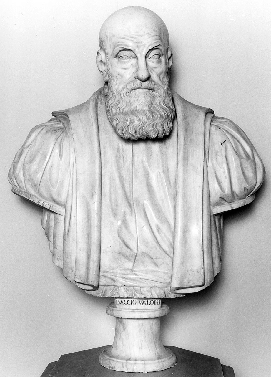 - NOTIZIE STORICO CRITICHE Al momento dell'acquisto nel 1959 il busto venne identificato con il ritratto di Baccio Valori ricordato dal Baldinucci come appartenente a Luigi Guicciardini. Martini tutavia confrontandolo con il ritratto del Valori nel Palazzo dei Visacci in Borgo Albizi a Firenze, non vi nota somiglianza e propone invece che il ritrattato sia Pier Vettori, anch'esso raffigurato nello stesso palazzo come erma. Ipotizza anche che possa essere stato commissionato dal Valori, accademico del Disegno, mecenate e collezionista d'arte, per collocarlo nell'Accademia del Disegno