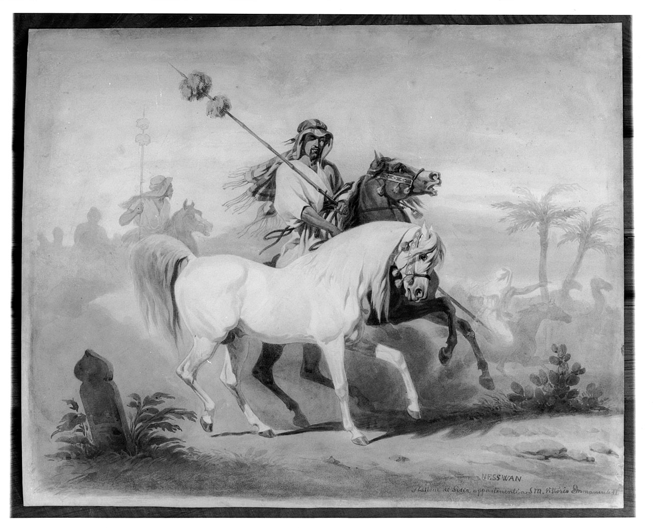 Animali: cavalli. Figure: cavalieri arabi. Paesaggi: deserto