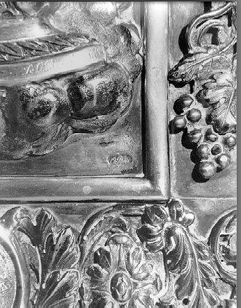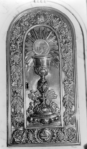 sportello in argento al centro calice con immagine del santissimo cornice data da tralci e girali vegetali dai quale fuoriescono grappoli di uva e spighe di grano in alto emblema della confraternita e in basso testa di S. Giovanni decollato