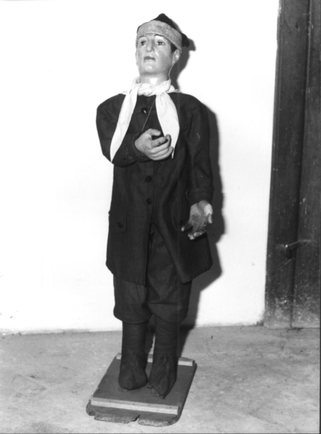 - NOTIZIE STORICO CRITICHE La statua fa parte del presepe di S. Maria Corteorlandini: si tratta di manichini prevalentemente di iuta ripieni di paglia cui sono applicate teste e mani in cartapesta dipinta. Ciascuno dei personaggi è individuato con caratteri fisiognomici diversificati e indossa abiti storici adattati alle diverse tipologie, con forti differenze tra le ricche vesti dei personaggi principali e quelle più umili dei pastori e contadini, come in questo caso. L'uso dei presepi vestiti si diffonde a partire dal XVII secolo, in coincidenza con le esigenze devozionali della chiesa controriformata. La tradizione si radica in modo particolare in ambito meridionale, soprattutto a Napoli, pur trovandosi alcuni notevoli esempi in ambiente ligure-lombardo. Il complesso lucchese è attestato già nel 1609, quando un inventario nomina "Ornamenti attinenti al Presepio", modificato e completato di personaggi e abiti nel corso del secolo XVII era probabilmente completo nel 1688, quando i documenti citano ventiquattro statue. Esso si distingue per le notevoli dimensioni delle statue, a grandezza naturale, e per la ricchezza del corredo realizzato in tessuti pregiati di lavorazione locale