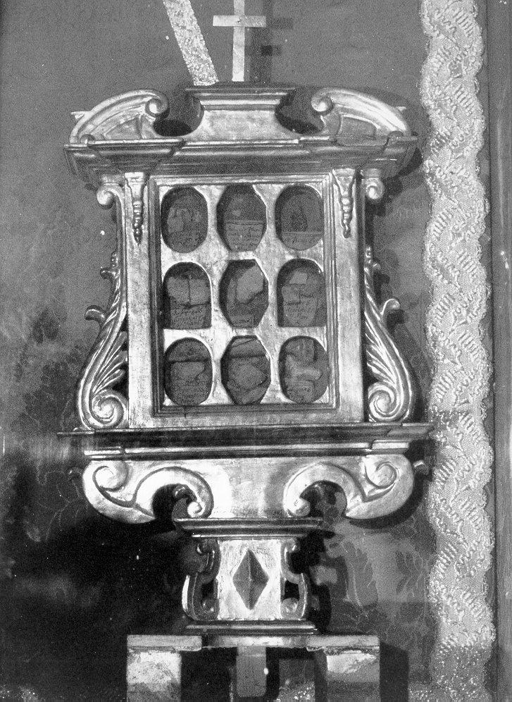 Reliquiario in legno intagliato e dorato, con tabella a foggia di edicola recante al centro nove piccole teche ovali