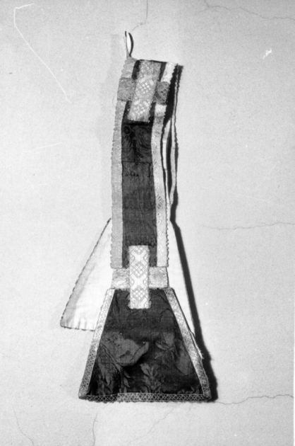 Pianeta viola completa di manipolo, stola e borsa di corporale. Tronchi di foglie allungate e sfrangiate con fiori tipo peonia e frutti esotici a calice puntinato, si susseguono paralleli con andamento ondulante verticale. Lo stolone anteriore, di sostituzione, è in damasco viola, recente, con maglie a losanga definite da tralci di foglie e contenenti infiorescenze. Gallone a telaio in seta e oro filato, a losanghe. Fodera in raso di cotone giallo; il bordo scollo è protetto da un colletto di tela di lino bianca con bordo di pizzo. La borsa ha la fodera in taffetas bordò