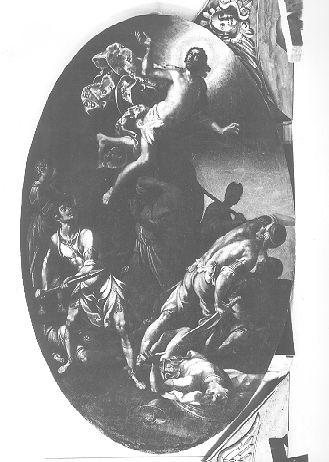 - NOTIZIE STORICO CRITICHE Il dipinto fa parte delle nove tele eseguite dal Lomi tra il 1609 e il 1611 per il soffitto della chiesa di San Silvestro a Pisa. Il progetto del soffitto fu eseguito da Cosimo Pugliani, mentre la realizzazione della parte lignea fu affidata a Bartolomeo Atticciati e al doratore Domenico di Girolamo Minazzi. Nel 1891 il soffitto venne completamente smontato con la supervisione di Leopoldo Tanfani Centofanti e i nove dipinti del Lomi furono trasportati negli edifici municipali e nel Museo Civico. Solamente nel 1989, dopo un accurato restauro, il soffitto ligneo e le tele furono ricollocati nella chiesa da cui provenivano