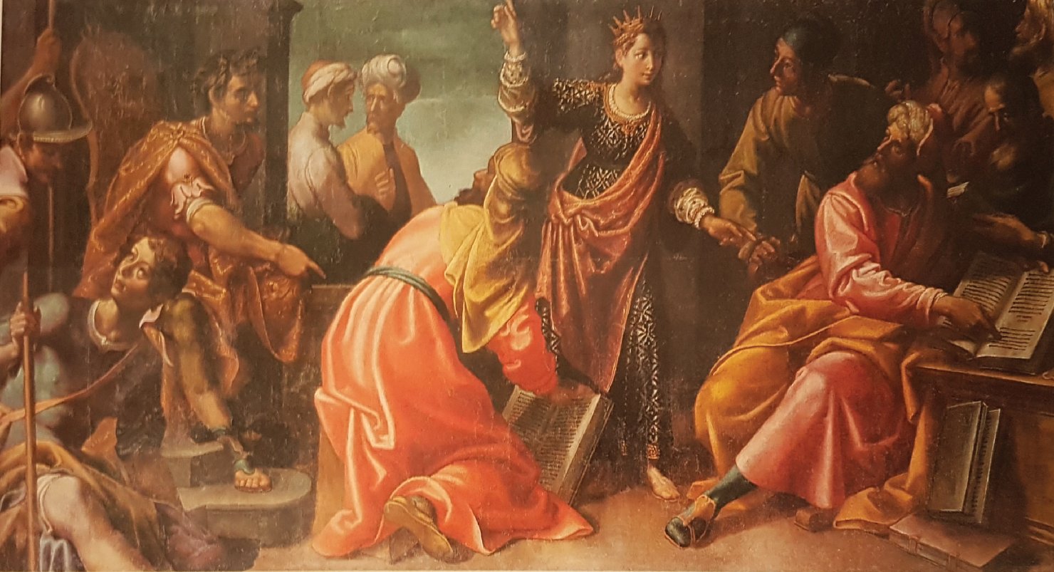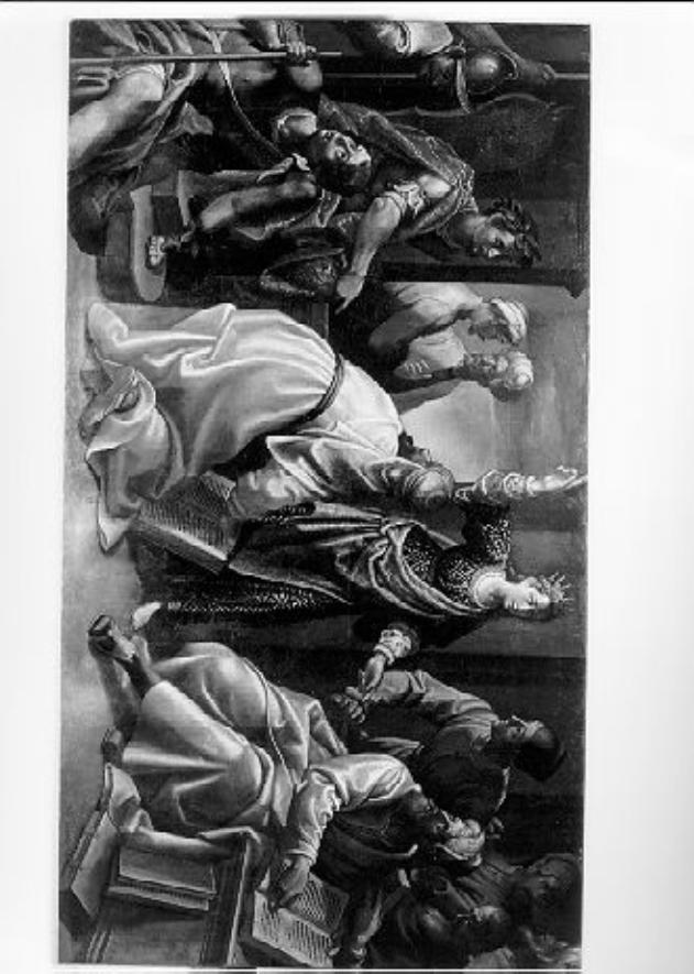 - NOTIZIE STORICO CRITICHE Il dipinto fa parte delle nove tele eseguite dal Lomi tra il 1609 e il 1611 per il soffitto della chiesa di San Silvestro a Pisa. Il progetto del soffitto fu eseguito da Cosimo Pugliani, mentre la realizzazione della parte lignea fu affidata a Bartolomeo Atticciati e al doratore Domenico di Girolamo Minazzi. Nel 1891 il soffitto venne completamente smontato con la supervisione di Leopoldo Tanfani Centofanti e i nove dipinti del Lomi furono trasportati negli edifici municipali e nel Museo Civico. Solamente nel 1989, dopo un accurato restauro, il soffitto ligneo e le tele furono ricollocati nella chiesa da cui provenivano