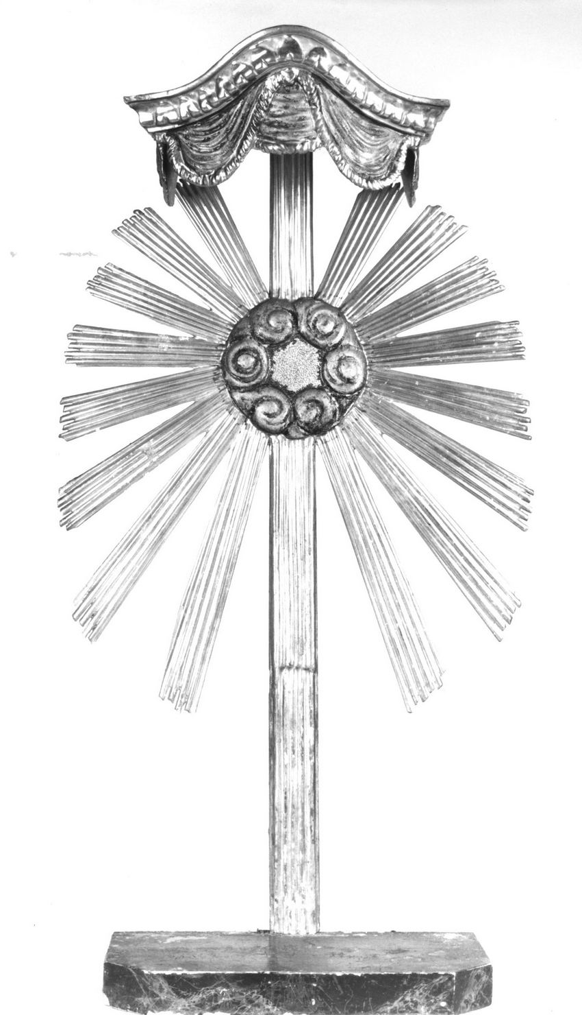 postergale da esposizione eucaristica in legno dorato con nuvole argentate al centro della raggiera. Sotto il baldacchino è dipinta la colomba dello Spirito Santo su fondo azzurro