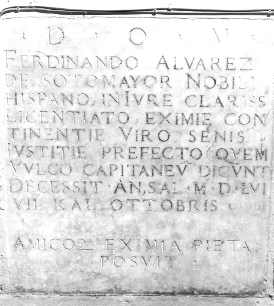- ISCRIZIONI sulla lapide - D(EO) O(PTIMO) M(AXIMO) / FERDINANDO ALVAREZ / DE SOTOMAYOR NOBILI / HISPANO, INIURE CLARISS(IMO) / LICENTIATO, EXIMIE CON/TINENTIE VIRO SENIS / IUSTITIE PREFECTO (QUEM / VULGO CAPITANEU(M) DICUNT) / DECESSIT AN(NO) SAL(UTIS) MDLVI / VII KAL(ENDAS) OTTOBRIS / AMICO(RUM) EXIMIA PIETAS / POSUIT - lettere capitali - a solchi -