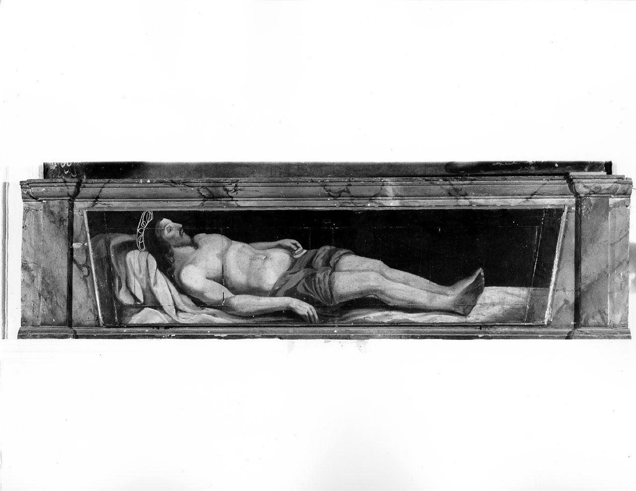 gradino d'altare dipinto marmorizzato con specchiatura al centro dipinta con Cristo deposto