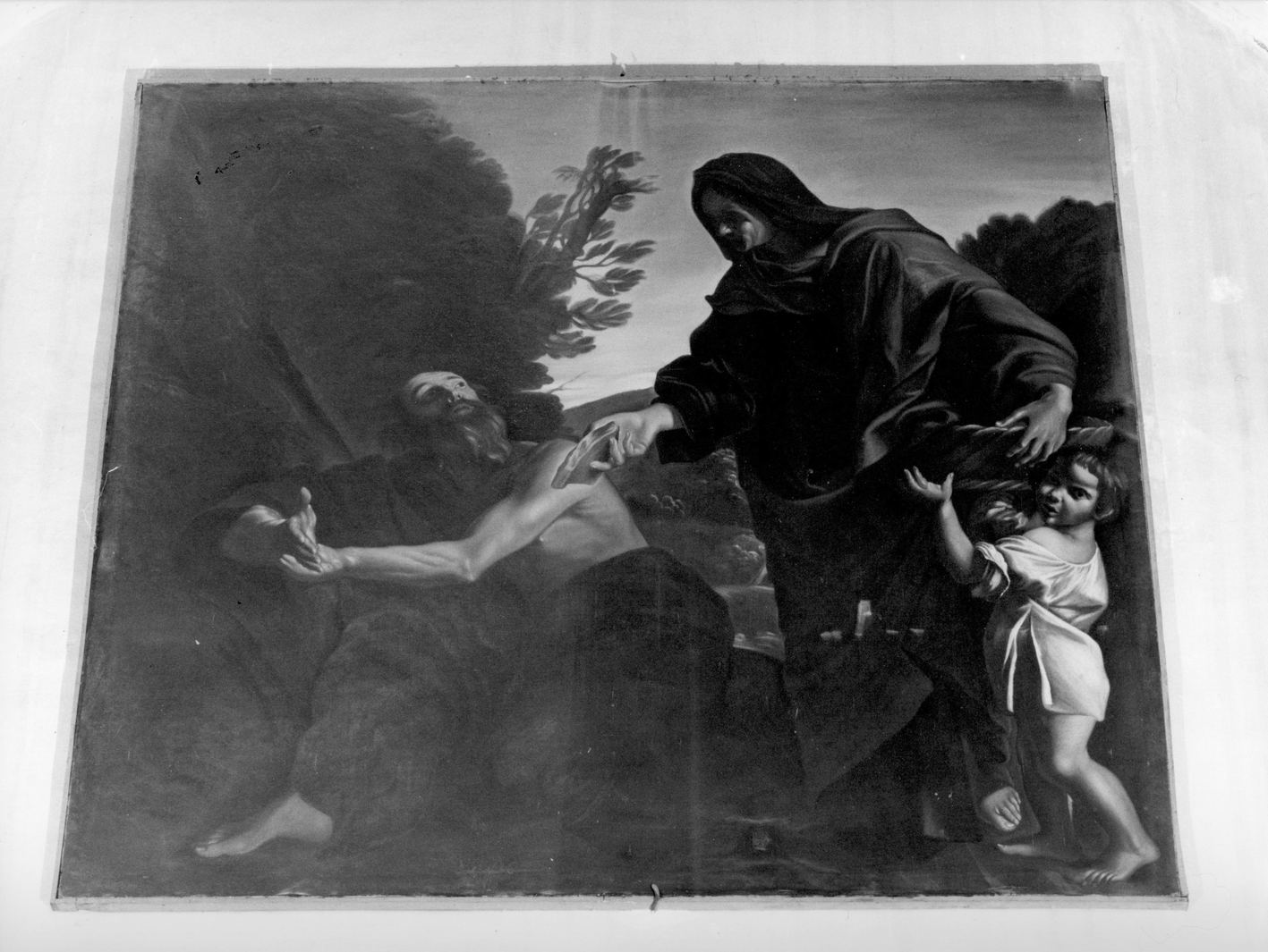 Il dipinto raffigura la scena biblica della vedova di Zarepta col figlio,che porge il pane al profeta Elia