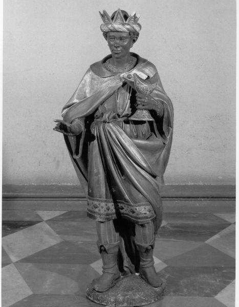 statua da presepio di re magio poggiante su base in legno tiene tra le mani navicella, sulla testa presenta turbante e corona, veste alla foggia orientale