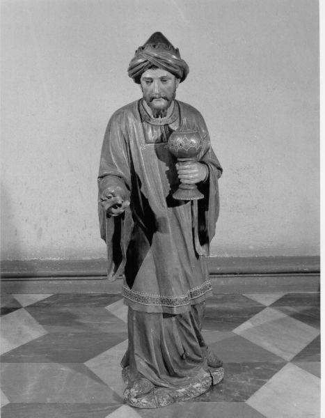statua da presepio poggiante su base lignea tiene con una mano contenitore a forma di pisside, volto con baffi e barba, testa avvolta da turbante, ampi panneggi delle vesti di foggia orientale
