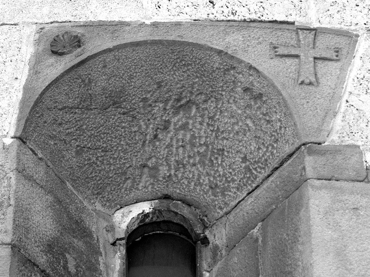 dal perimetro non regolare, ma svasato sul lato destro; l'elemento è incor niciato da un listello liscio e piatto; nei due pennacchi, rispettivamente una corolla molti petali ed una croce greca dalle estremità tripartite