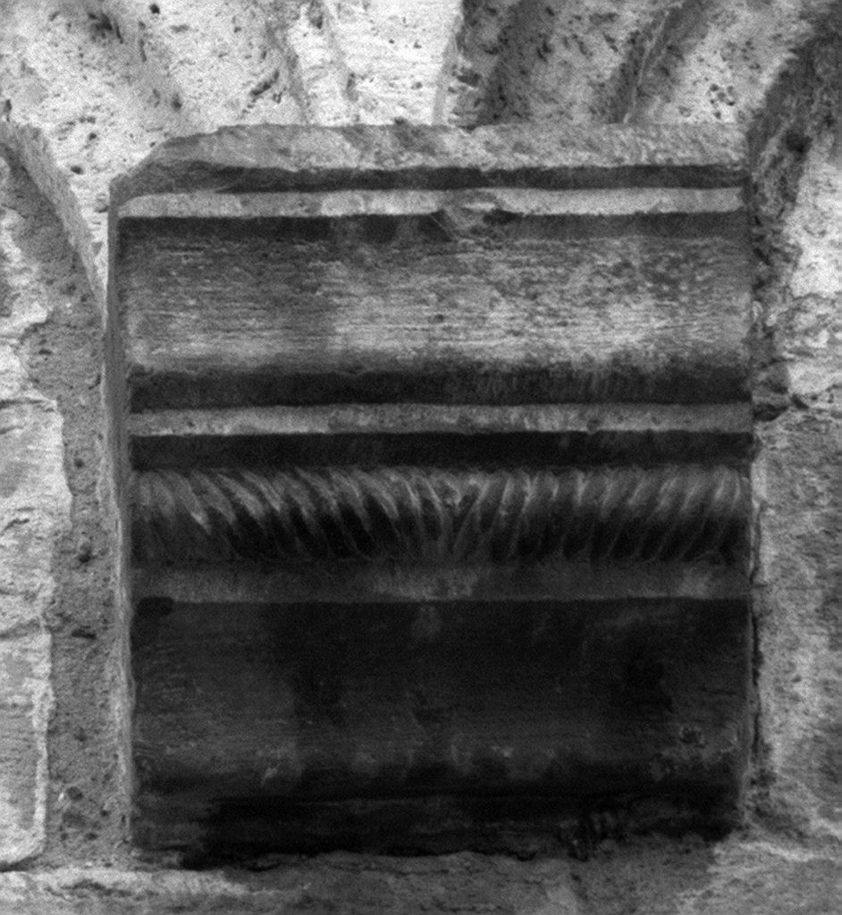 impostata su base quadrangolare, è costituita da modanature a gola supplem entari; al centro, una fune con andamento speculare rispetto all'asse cent rale