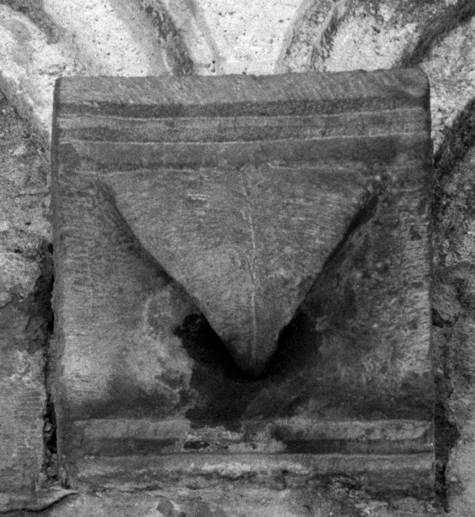 impostata su base quadrangolare, delimitata da listelli scanalati; al cent ro, una foglia d'acqua appuntita