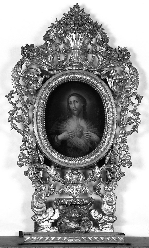 ad andamento ovale, delimitata da una cornice di foglie, due cornici perlinate e un ricco motivo fitomorfo con nastri e girali