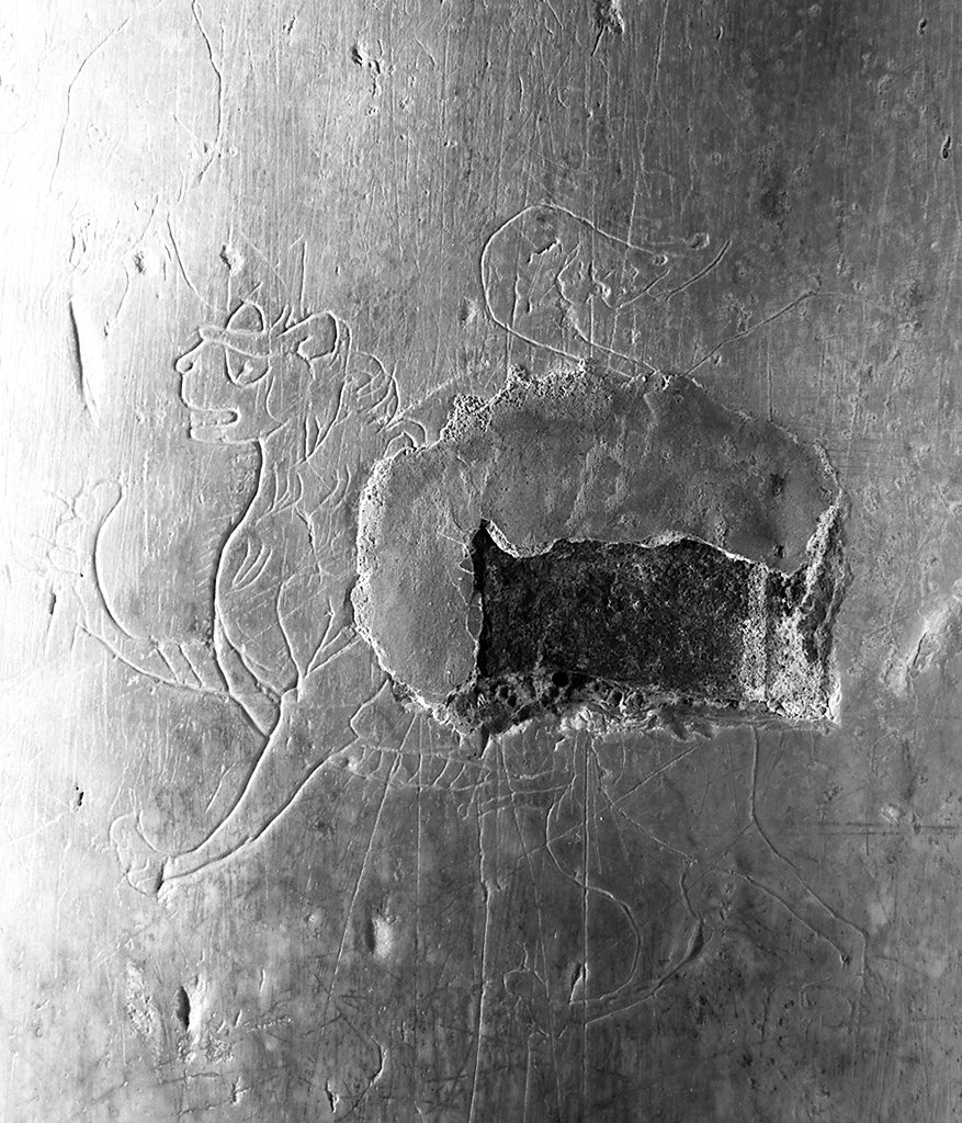 - NOTIZIE STORICO CRITICHE | NSC = per le considerazioni generali v. scheda 0900424451. I felini di q uesto ciclo di graffiti, che compaiono in tre differenti redazioni (v. sch ede 0900424456 e 0900424458) sono disegnati secondo gli schemi della icono grafia araldica, caratterizzata da leggi compositive ferree e da una note vole capacità sintetica, presentati sempre di profilo e passanti verso si nistra. Sono inoltre tracciati con ineguali esattezza e profondità di solc o. In questo esemplare la cronologia genericamente tardomedievale (e segn atamente, tra fine XIII e metà XIV secoli), sembra confermata da un dettag lio marginale: la coda che si sfrangia in terminazioni foliacee, dai lobi frastagliati, rivelando una propensione per gli effetti metamorfici che, se già sperimentata in fase romanica, trova proprio nel XIII secolo, ed i n particolare nella maestranza di Guidetto/Guido da Como, una estrema raf finatezza di esiti compositivi e stilistici (valgano per tutti le mensole (SEGUE IN OSSERVAZIONI:)