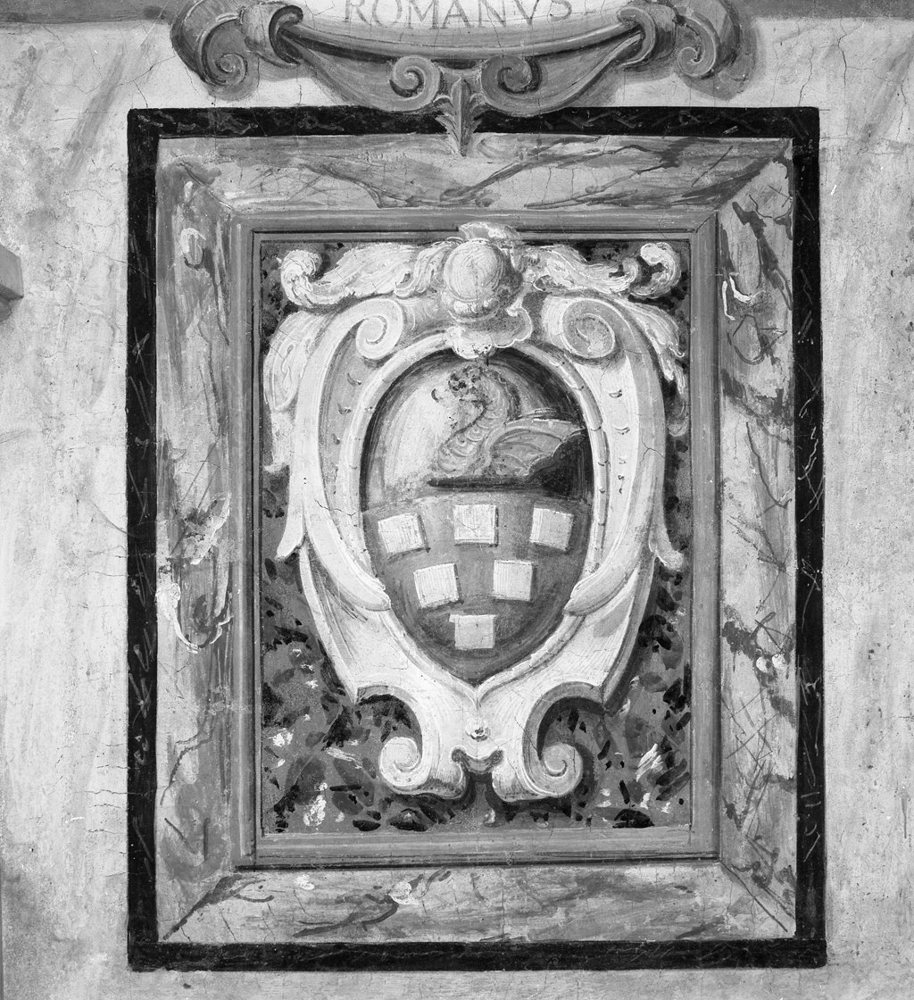 figura inserita in finta nicchia; nella parte superiore lapide con cornice sagomata e volute; nella parte inferiore cartiglio e stemma entro cornice a finto marmo