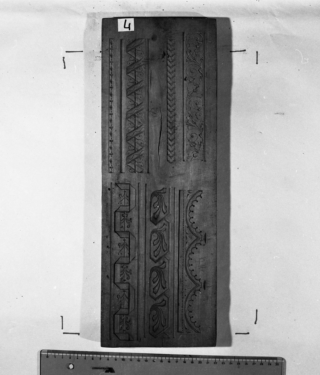 Stampo in legno realizzato con la tecnica dell'intaglio a sgorbia, utilizzato come modello per la decorazione di campane in brozo. La superficie ospita un repertorio di ornamenti, esattamente 7 fregi: 1) sottili girali fogliati; 2) sequenza di piccole squame geometriche; 3) una bandinella a zig zag con rigido stelo che porta elementi decorativi lineari; 4) motivo geometrico a losanghe ed ovali; 5) una fila di perline corona tre arcatelle i cui intradossi ospitano un motivo a petali, mentre gli estradossi presentano elementi alati; 6) girali fogliati geometrizzati; 7) bandinella a meandro con asta che motivi floreali stilizzati. Stampo numerato a lato: XXX